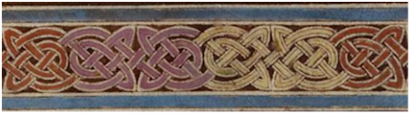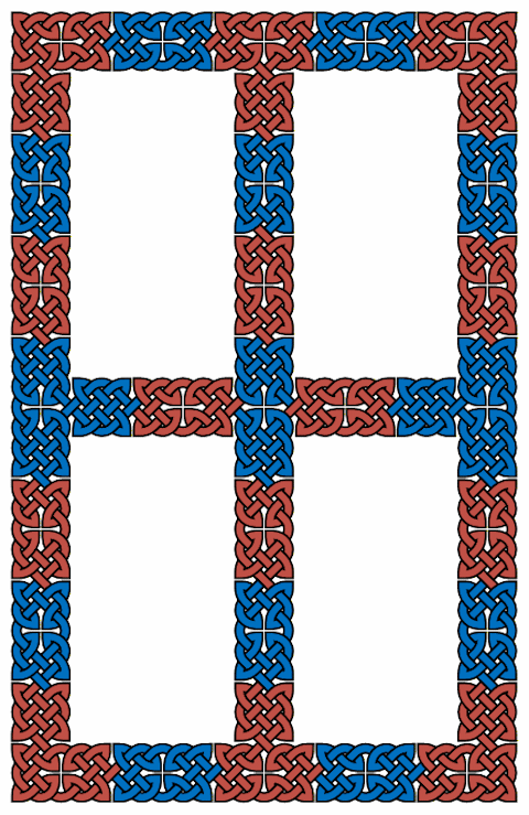 1. To the left is the underlying panel template and band treatment, from [BainI], page 103, based on a pattern found in Kells, Folio 124R. It is a 2X4 cell pattern, with the repeating group offset by a half cell. |