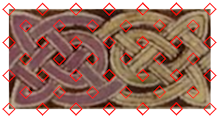 4. Look at the "holes" in the knots (outlined in red) to determine the underlying cell patterns. In this case, I started in the middle where the pattern was least broken (look for simple interlace patterns) and worked my way out. After the cell pattern starts to emerge, it becomes easier to complete it across the more complex areas. For borders concentrate on cell width; with panels the panel dimensions (width X height). |